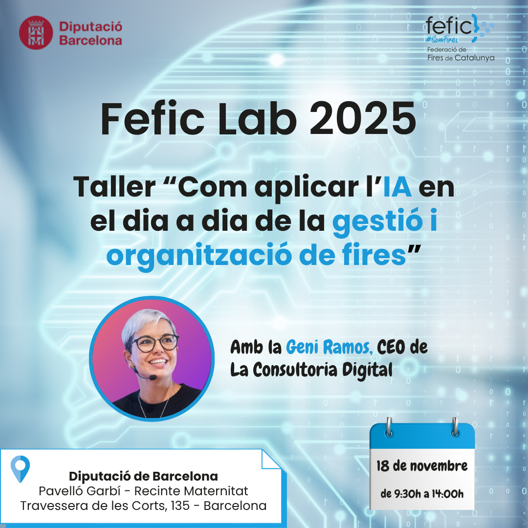 El pròxim dimarts 18 de novembre, celebrem una nova edició de la FEFIC Lab, amb l’objectiu de donar continuïtat al 32è Congrés de Fires de Catalunya celebrat el passat mes de juny a Agramunt. Enguany realitzarem el Taller per com aplicar la IA en el dia a dia de la gestió i organització de fires…